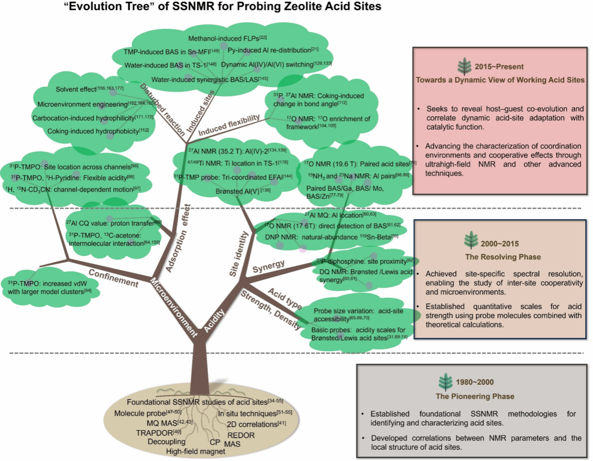 固体核磁共振(SSNMR)技术因其能够将微弱的主客体相互作用转化为原子尺度上的可观测信号,成为揭示上述动态过程的关键工具。该论文系统梳理了过去四十余年间SSNMR在分子筛酸性研究中的应用进展,基于研究团队自身在固体核磁共振与催化材料交叉领域的长期积累,采用“进化树”这一可视化叙事方式,清晰勾勒出从静态表征到动态追踪的学术演进脉络。在此基础上,作者结合当前技术发展与科学认知的交叉趋势,前瞻性地识别出该领域未来的核心突破方向,为新一代分子筛催化体系的理性设计提供了理论依据与方法论支撑。